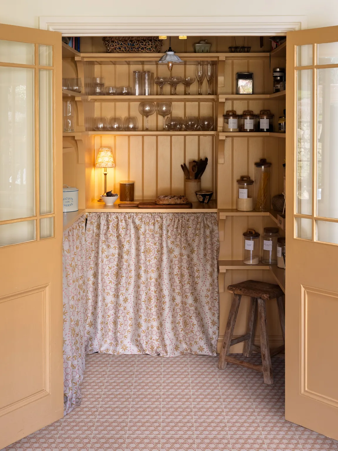 Pantry floor tiled in the Malla Terracotta with shelf curtains in Palma Sol Ochre Trio.