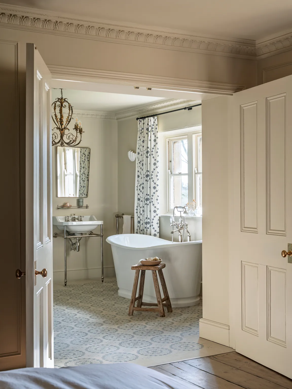 Bathroom floor in Palma Blue, curtain in Palma Nu Inky Sky.