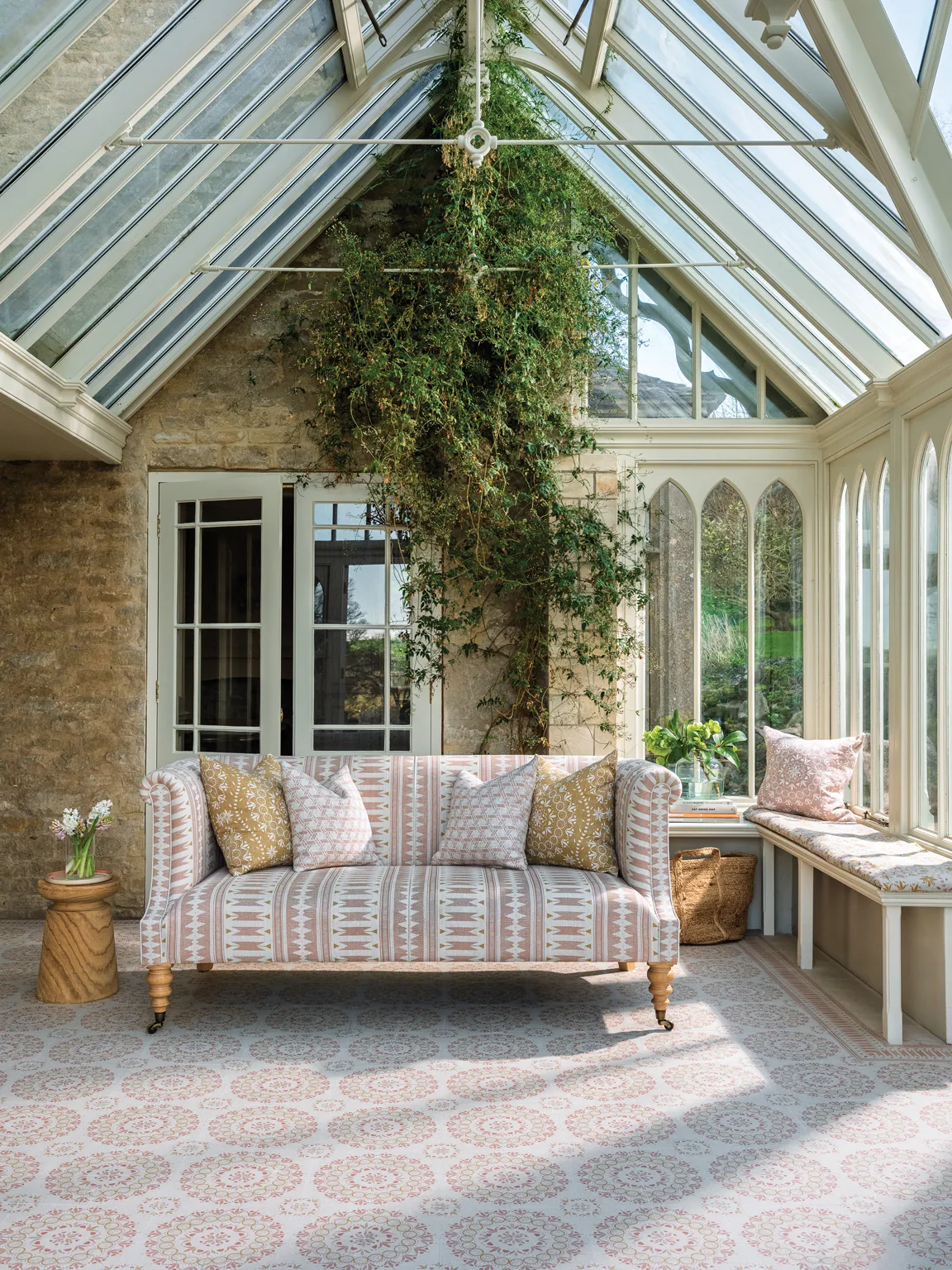 Orangery floor in Palma Terracotta tiles, seen alongside sofa upholstered in Ziggy Molinos Toasted Almond with cushions in Palma Sol Antique Ochre and Malla Toasted Almond. Window seat cushion upholstered in Palma Sol Ochre Trio with a cushion in Palma Sol Powder.