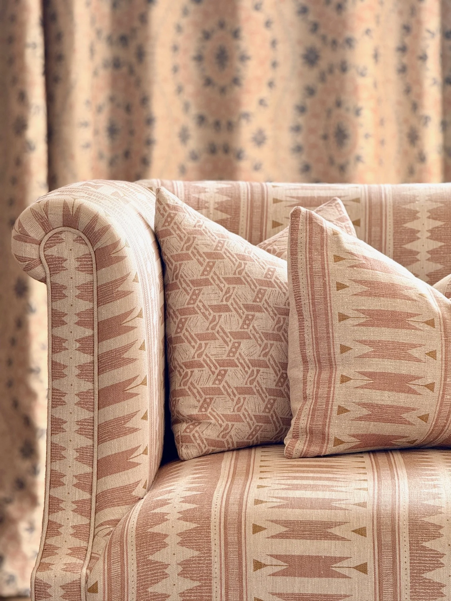 Our bestselling fabric, Ziggy Molinos Toasted Almond, has been worked into a new bolster style rectangular cushion. The cushion is plain backed so is a more economical way to include the fabric into your home.
