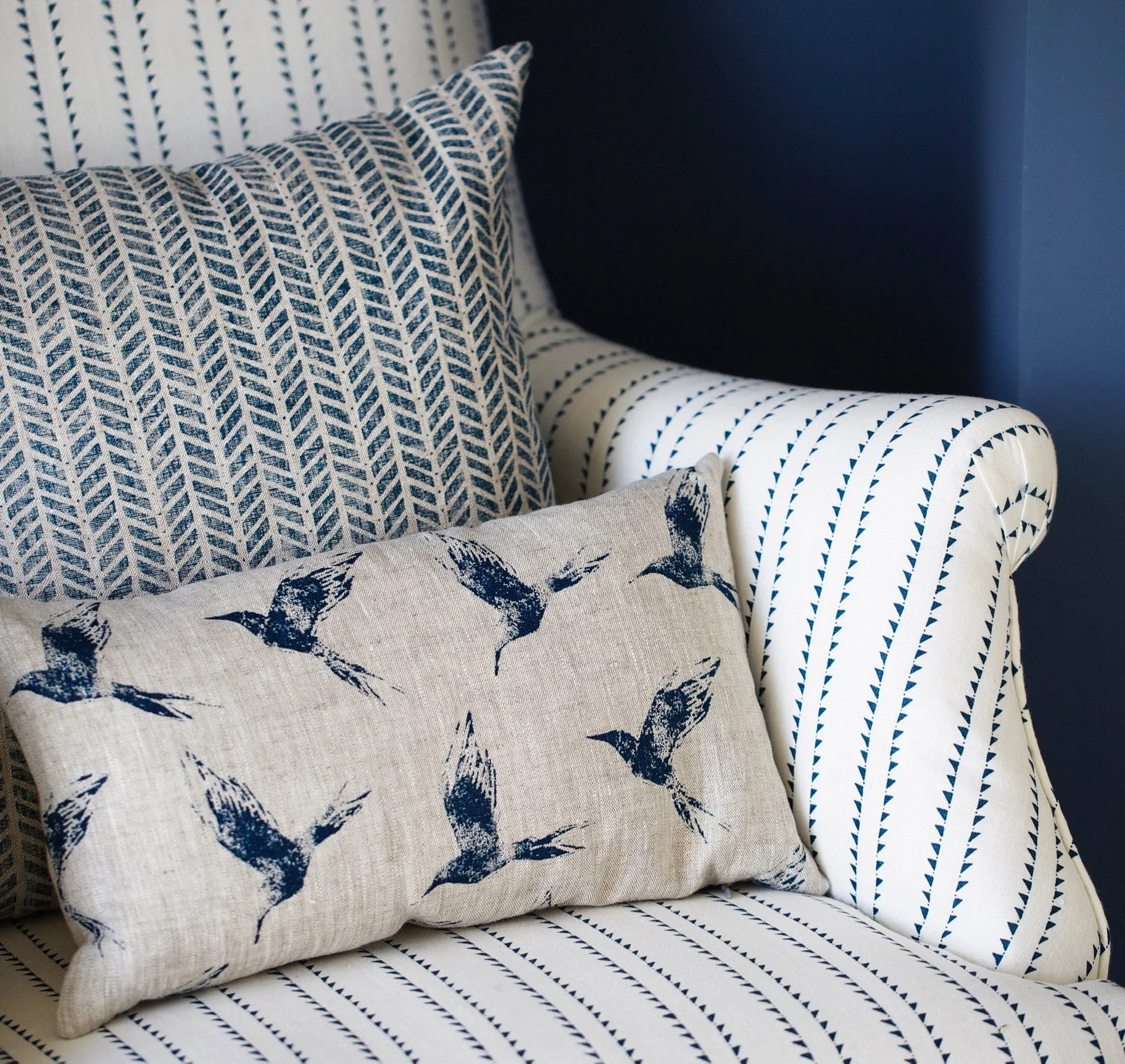 Timeless Meadowlands Collection printed linens featuring upholstery in Windmill Wood Inky Sky, Cushions in Bollin Bird Inky Sky and Mottram Meadow Inky Sky.