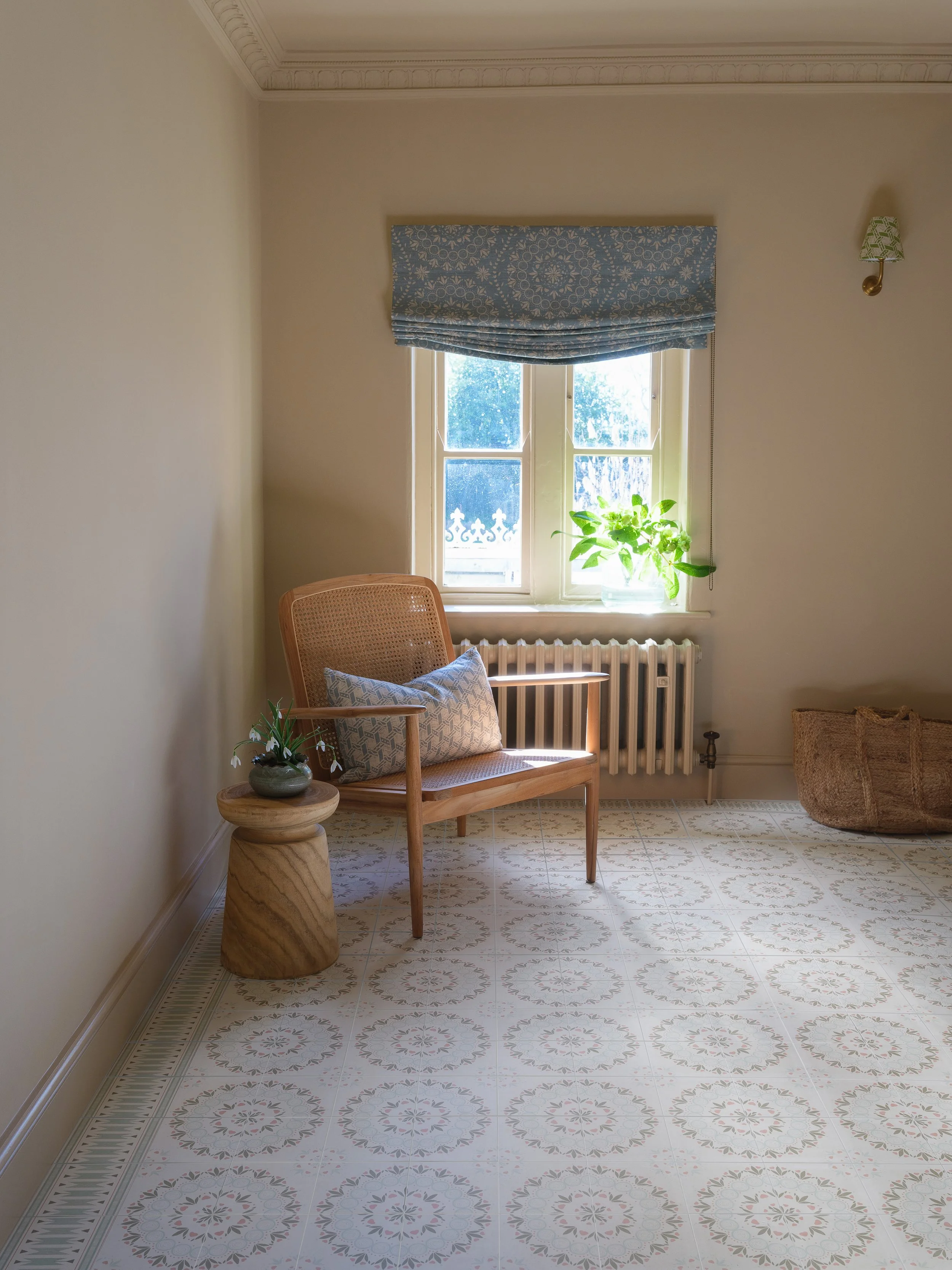 When it comes to creating a cohesive, gentle design scheme with fabric and tiles the Aventuras Fabric Collection works in perfect partnership with the Aventuras Tiles. Blind made in Palma Sol Bay Blue below with Palma Sol Olive tiles on the floor with a Ziggy Border. Cushion made from Malla printed linen in Terrace Blue. Mini Lampshade made from Malla Apple printed linen (these can be handmade to order in any fabric).